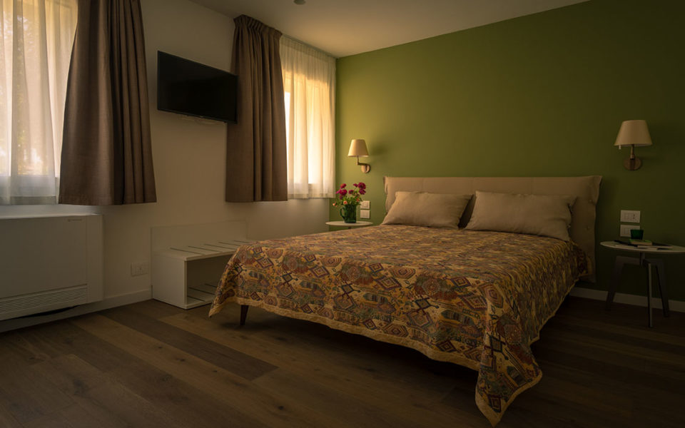 Ampia camera al piano primo di 25 mq, mansardata con travi a vista. Dotata di un comodo letto matrimoniale e zona relax che si affaccia, grazie ad una ampia vetrata, sulla piccola valle delle Mad...
